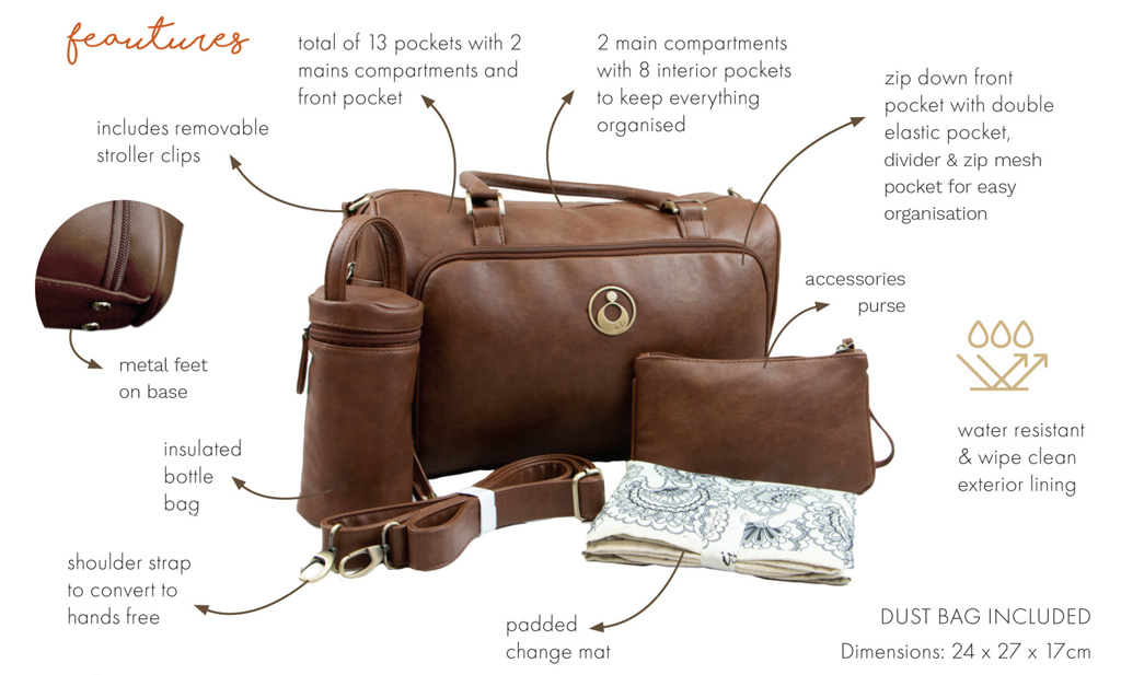 With a total of 13 pockets, it holds everything you need for baby. The two main inner compartments have pockets to hold nappies, clothes, toys, wipes and creams. It’s fully lined with beautiful bespoke Isoki waterproof fabric and closes with a zipper to keep contents secure. The outside front pocket is perfect for keys, wallet and phone. This is the style solution for mums travelling and everyday use.